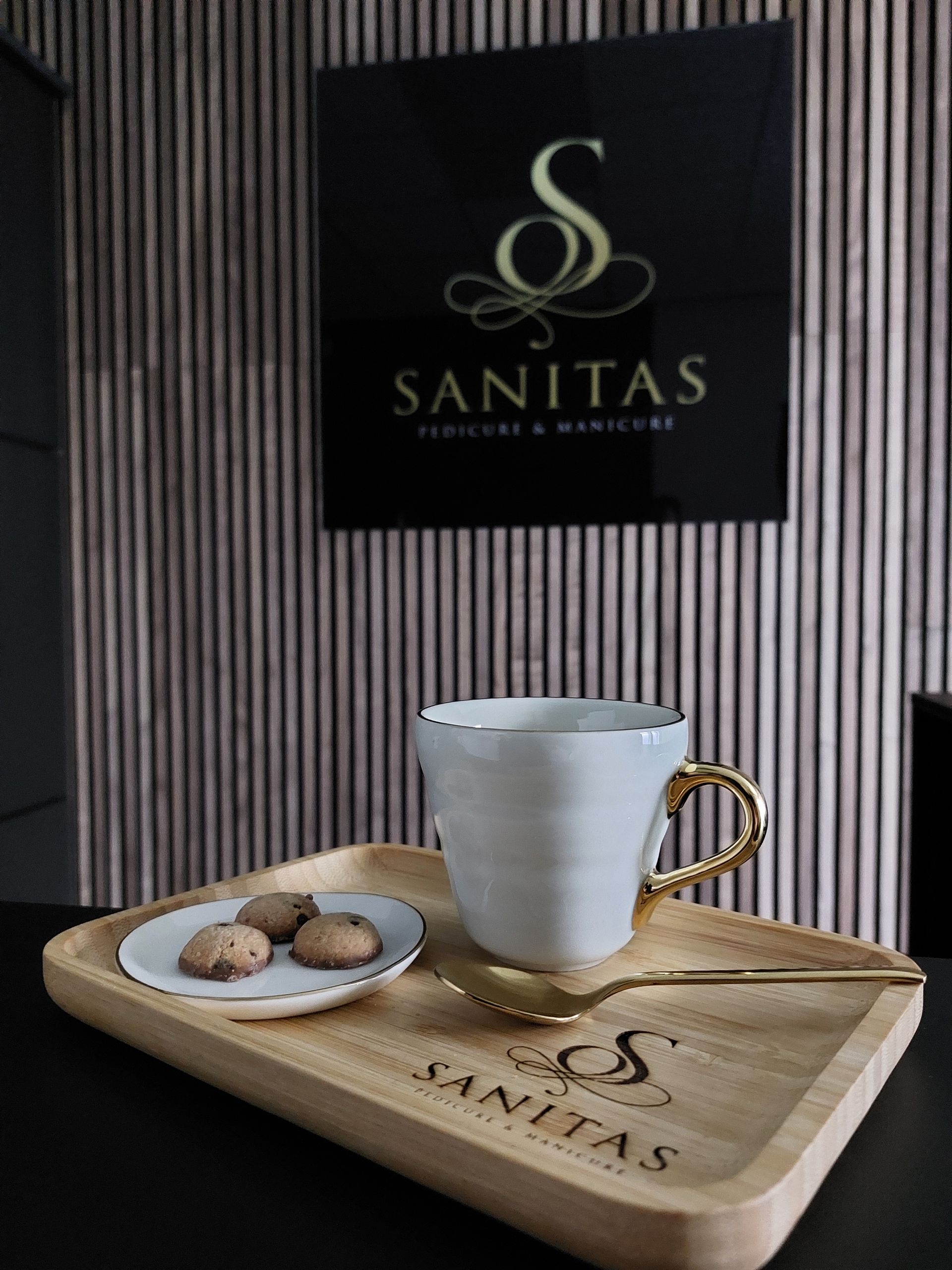 Bij Sanitas kunt u gewoon genieten van een kopje koffie terwijl u in de stoel kunt blijven zitten na uw pedicure behandeling voor een welverdiende manicure.