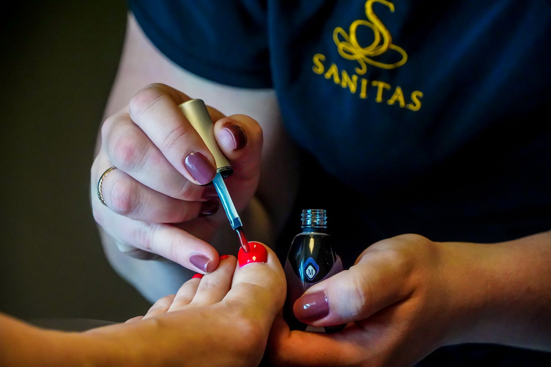 Bij ons is een pedicure behandeling niet standaard, een behandeling is niet alleen doeltreffend maar ook een welverdiende verwennerij. Tijdens een pedicure behandeling worden uw teennagels in een mooie vorm gebracht, dode huidcellen verwijderd, worden de nagelomgeving schoongemaakt en word er afgesloten met een heerlijke verzorgende crème speciaal afgestemd op uw voeten. Wilt u meer ontspanning ervaren dan kunt u een luxe pedicure behandeling plannen, hierbij krijgt u langs de standaard behandeling een warm voetenbad met kruidenzout, worden de voeten gescrubd , een voetenmasker en krijgt u afsluitend een heerlijke voetmassage. Ook hebt u de keus om uw nagels te laten lakken met een gelpolish uit de Magnetic collectie waarbij Sanitas meer dan 250 kleuren heeft om te kiezen, altijd iets wat voor u past.